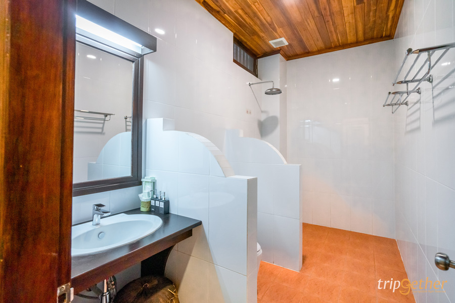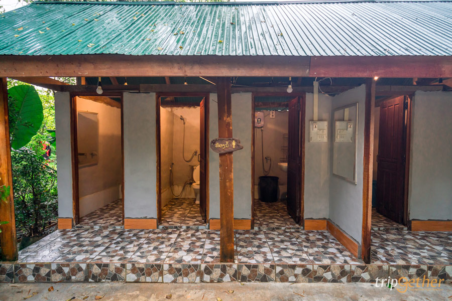ส่วนของห้องน้ำเราต้องขึ้นมาใช้ที่ห้องน้ำด้านหลัง ซึ่งทางเรือนแพวังน้ำทิพย์จะมีห้องน้ำรวมไว้ให้ ไม่ต้องกังวลเรื่องความสะดวกหรือความสะอาดเลย เพราะห้องน้ำเขาทำดีมากๆ แบ่งสัดส่วนชัดเจน แถมยังมีหลายห้องด้วย