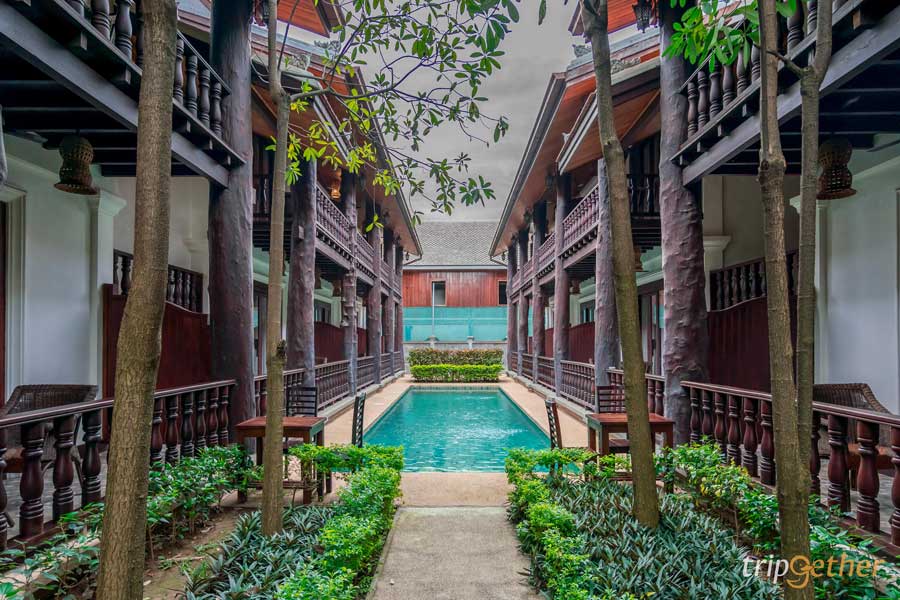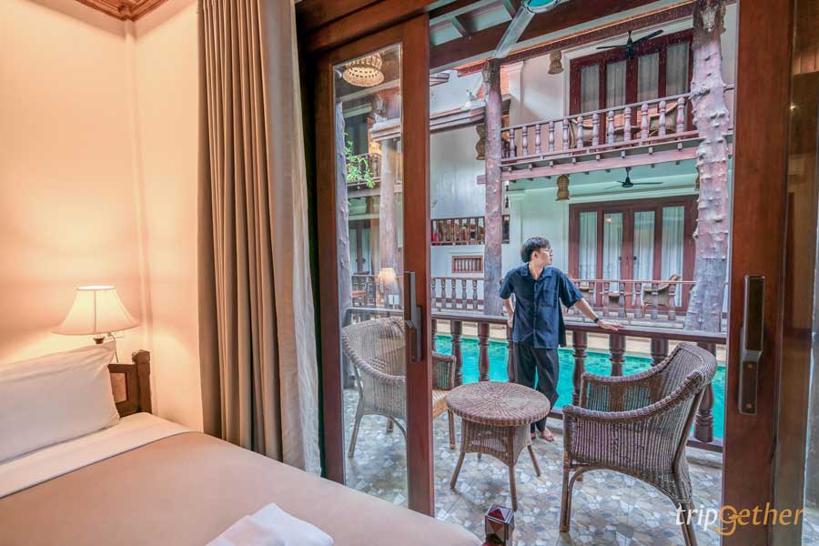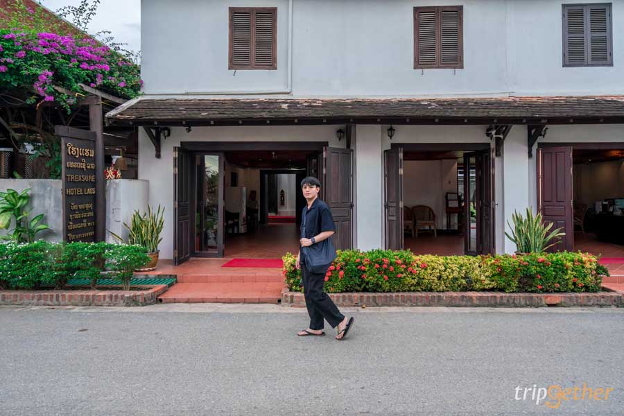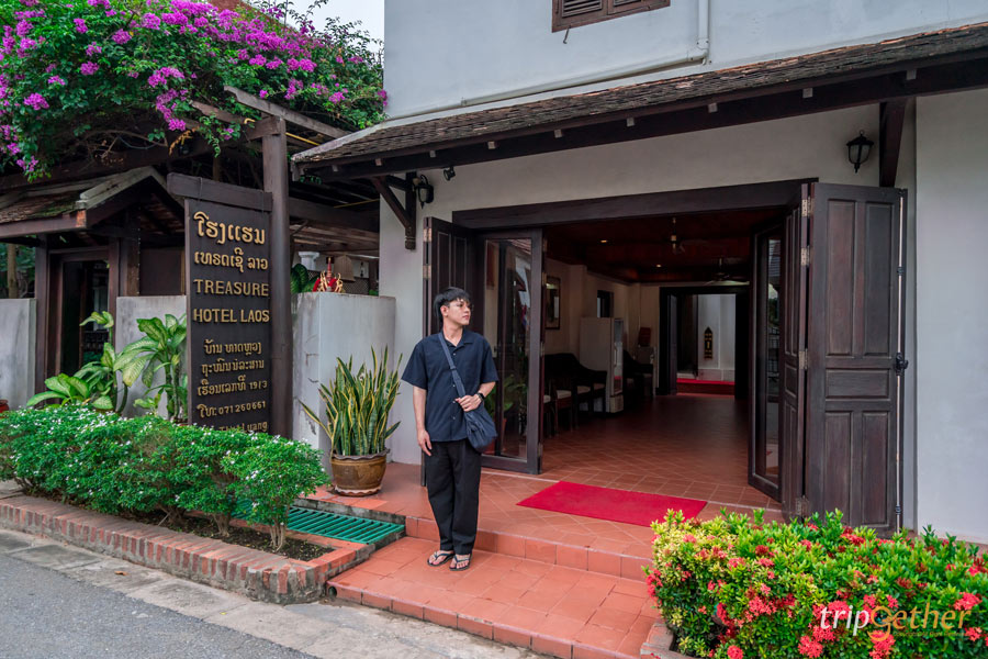 กินข้าวเสร็จก็ได้เวลาเข้าไปเช็คอินที่พักกันต่อ โดยคืนนี้เราพักที่ Treasure Hotel โรงแรมในเมืองหลวงพระบางที่มาพร้อมกับเสน่ห์และกลิ่นอายของความเป็นหลวงพระบางแบบสุดๆ เพราะอาคารของโรงแรมเป็นอาคารก่ออิฐถือปูนตามสถาปัตยกรรมแบบยุโรปผสมผสานความเป็นหลวงพระบางด้วยการใช้เสาที่ทำจากไม้ทั้งต้น รวมทั้งเฟอร์นิเจอร์ที่ทำจากไม้ได้อย่างลงตัว แถมยังเป็นโรงแรมเล็กๆ มีเพียง 2 ชั้น และมีห้องพัก 49 ห้องเท่านั้นเอง บอกเลยว่าสงบและผ่อนคลายมากๆ