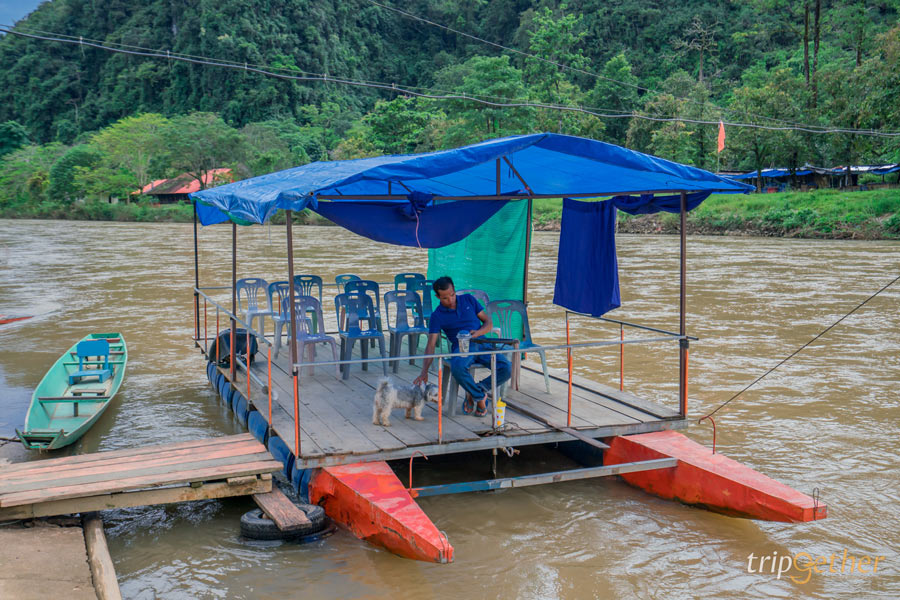 อิ่มท้องแล้ว เราก็ไปลุยใช้พลังงานกันต่อที่ถ้ำจัง สถานที่ท่องเที่ยวทางธรรมชาติสุดอันซีนของวังเวียง ซึ่งพอเรานั่งรถมาถึงที่ทางเข้าแล้ว เราจะต้องนั่งเรือ (จริงๆ ก็ไม่เหมือนเรือ เหมือนศาลาที่นั่งข้ามน้ำมากกว่า) ข้ามฟากไปอีกฝั่ง เนื่องจากสะพานส้มพัง โดนน้ำพัดเสียหาย