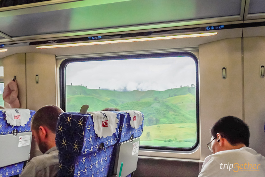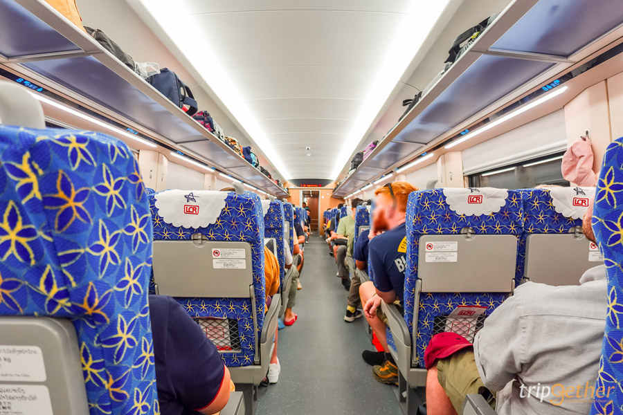 เราไปรถไฟรอบ 12.02 น. ซึ่งเวลาประมาณ 11.35 น. เจ้าหน้าที่ก็เรียกให้ผู้โดยสารไปต่อคิวขึ้นรถที่ชานชาลาแล้ว เลขที่นั่งและเลขตู้รถสามารถดูได้จากในตั๋วโดยสารเลย ระหว่างขึ้นรถไฟก็แอบวุ่นวายอยู่บ้าง เพราะคนเยอะอยู่เหมือนกัน (ส่วนใหญ่เป็นชาวต่างชาติ) แต่พอถึงเวลา 12.02 น. ปุ๊บ รถก็ออกตัวทันที ตรงเวลามากๆ