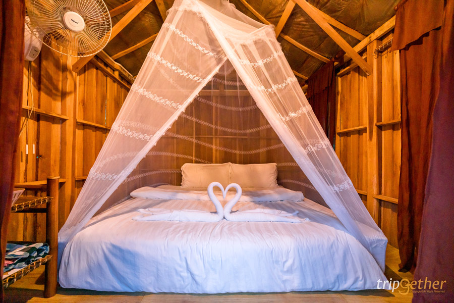 พาดูบรรยากาศไปแล้ว มาดูในห้องกันบ้าง ภายในเรือนแพจะมีแค่ส่วนของห้องนอนนะ มีเตียงที่นอนได้ 2 คน มีมุ้งคลุม มีพัดลมให้พร้อม แถมประตูหน้าห้องยังเป็นประตูบานกระจกที่มองเห็นน้ำได้จากบนเตียง ชิลล์มาก ราคาอยู่ที่ 1,200 บาท/2 คน/คืน เท่านั้นเอง