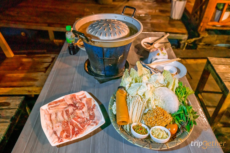 พักผ่อน เดินเล่นดูบรรยากาศได้สักพักฟ้าก็เริ่มมืดพอดี ซึ่งเย็นนี้สบายสุดๆ เราไม่ต้องออกไปหาของกินที่อื่นเลย เพราะทางเรือนแพวังน้ำทิพย์มีอาหารเย็นที่เป็นอาหารตามสั่งและเซ็ตหมูกระทะให้บริการด้วย พอได้ยินว่ามีหมูกระทะเท่านั้นแหละ สั่งมาเลย 1 เช็ตแบบไม่ลังเล ราคา 200,000 กีบ (ประมาณ 327 บาทเท่านั้นเอง) สั่งมานั่งกินริมน้ำ หน้าห้องกันยาวๆ