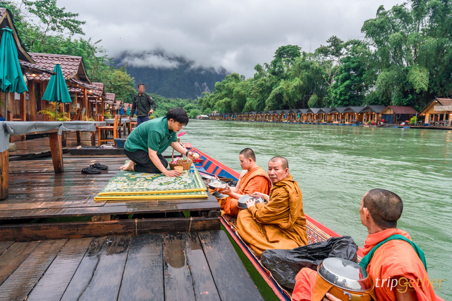 วันที่ 2 เราตื่นกันแต่เช้ามาสูดอากาศดีๆ พร้อมกับรอใส่บาตรกันที่หน้าเรือนแพ โดยชุดใส่บาตรทางที่พักจัดเตรียมไว้ให้เรียบร้อย (แต่ต้องแจ้งกับทางที่พักตอนเช็คอินด้วยนะ เขาจะได้เตรียมไว้ให้) ราคาอยู่ที่ชุดละ 60,000 กีบ ประกอบไปด้วย ธูป เทียน อาหารแห้ง ข้าวเหียว และน้ำ ส่วนของน้ำเนี่ยมีอยู่ 2 ขวด แบ่งเอาไว้ใส่บาตรหนึ่งขวด แต่อีกขวดเป็นน้ำหยาดเอาไว้ตอนกรวดน้ำนะ