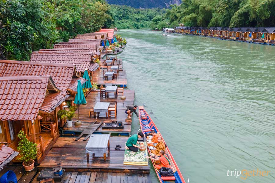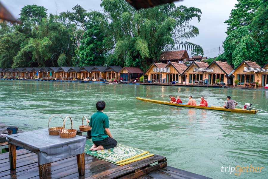 นั่งเล่น ดูวิวได้สักพัก พระท่านก็นั่งเรือหางยาวมาเทียบหน้าแพเลย ซึ่งเวลาปกติแล้วพระจะมาบิณฑบาตรประมาณ 06.30 น. แต่วันที่เราไปในช่วงเช้ามีฝนลง พระท่านเลยมาถึงหน้าแพเราประมาณ 7 โมงนิดๆ
