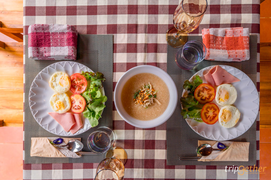 ใส่บาตรแล้ว ก็เติมพลังกันก่อนลุยต่อด้วยอาหารเช้า ซึ่งเซ็ตเมนูอาหารเช้าของเรือนแพวังน้ำทิพย์จะเสิร์ฟมาเป็นแบบ breakfast เพิ่มด้วยข้าวต้มไก่ฉีกที่อร่อยมากๆ