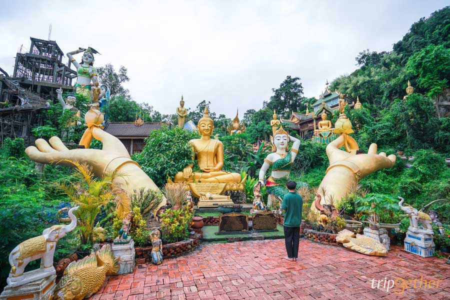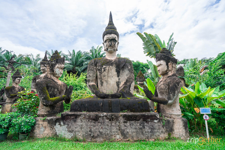 จุดที่ 5 มาพร้อมกับความเย็นแบบขลังๆ อย่างบอกไม่ถูก เพราะจุดนี้เป็นสวนเวฬุวัน หรือที่แปลว่าสวนป่าไผ่ เป็นการจำลองเหตุการณ์ในวันมาฆบูชา ที่มีพระอรหันต์มาประชุมกันโดยมิได้นัดหมาย และเป็นวันที่พระพุทธเจ้าแสดงปฐมเทศนา จริงๆ ในไทยก็มีหลายที่นะที่ได้จำลองเหตุการณ์แบบนี้มา แต่ที่นี่ให้ความรู้สึกที่ต่างออกไปมากๆ เลยล่ะ สงบ ร่มเย็น สบายใจมากๆ และไฮไลท์อีกอย่างก็คือพระพุทธรูปประธานของสวนเป็นพระพุทธรูปหินทรายที่มาจากจำปาสัก ลาวใต้ แถมยังนับว่าเป็นพระพุทธรูปหินทรายที่ใหญ่ที่สุดในลาวด้วย