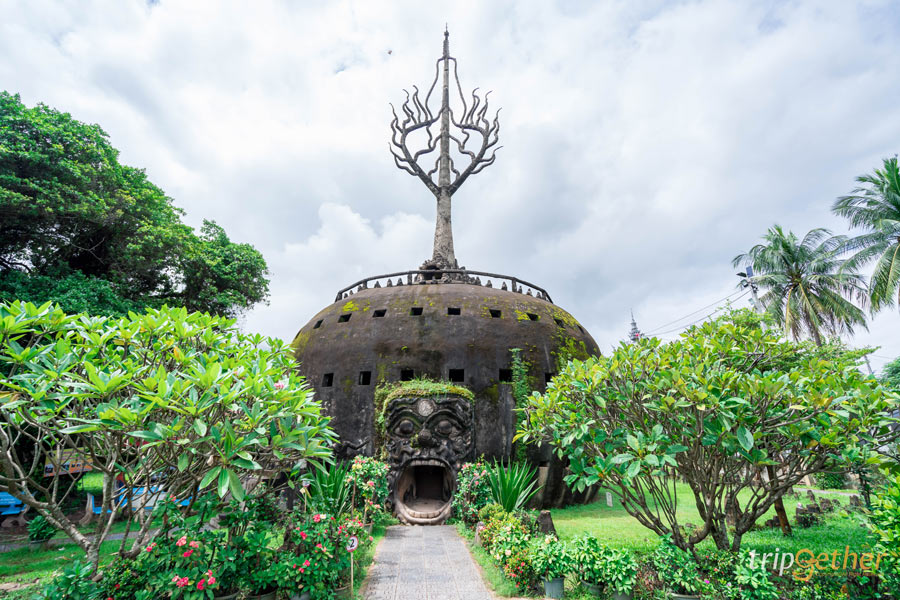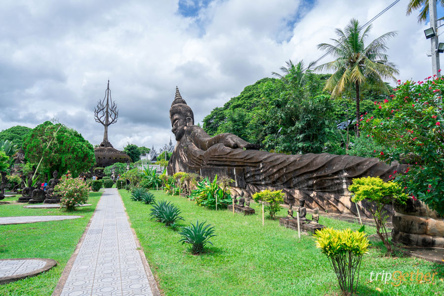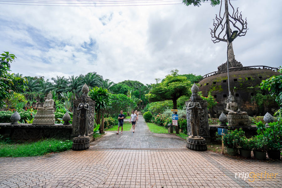 เช็คอินได้รูปสวยๆ จากประตูชัยกันแล้ว เราก็ขึ้นรถออกมานอกเมืองเวียงจันทน์กันหน่อย เพื่อมาเช็คอินโลเคชั่นที่สองกันต่อกับสวนวัฒนธรรมเชียงควน หรือที่คนไทยหลายๆ คนเรียกว่า สวนพระ แค่ด้านหน้าของทางเข้าสวนวัฒนธรรมก็สวยอลังการมากๆ มีทั้งประติมากรรมปูนปั้นลวดลายดอกไม้ มีสิงห์ตัวใหญ่อยู่สองฝั่งทางเข้า ให้ความรู้สึกขลังมาก