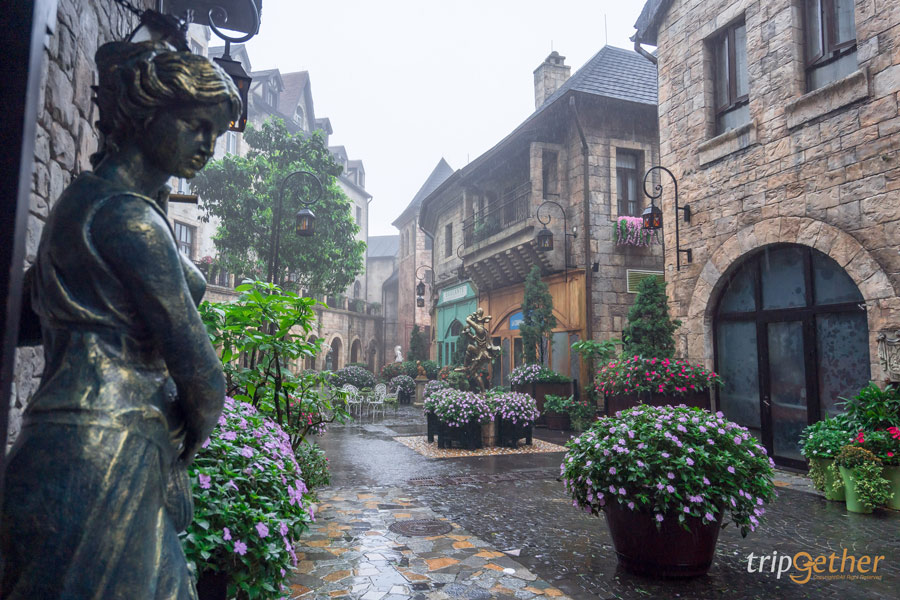 บรรยากาศรอบๆ ตอบโจทย์การมาพักผ่อนแบบสายคอนเทนต์มากๆ เพราะไม่ว่าจะมุมไหนของหมู่บ้านฝรั่งเศสก็คุมโทนความเป็นยุโรปทั้งหมด แถมยังมีกระถางดอกไม้ รูปปั้นสวยๆ ตกแต่งไว้ได้แบบสวยอลังการมากๆ