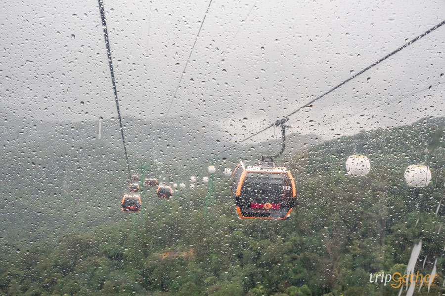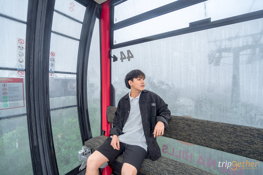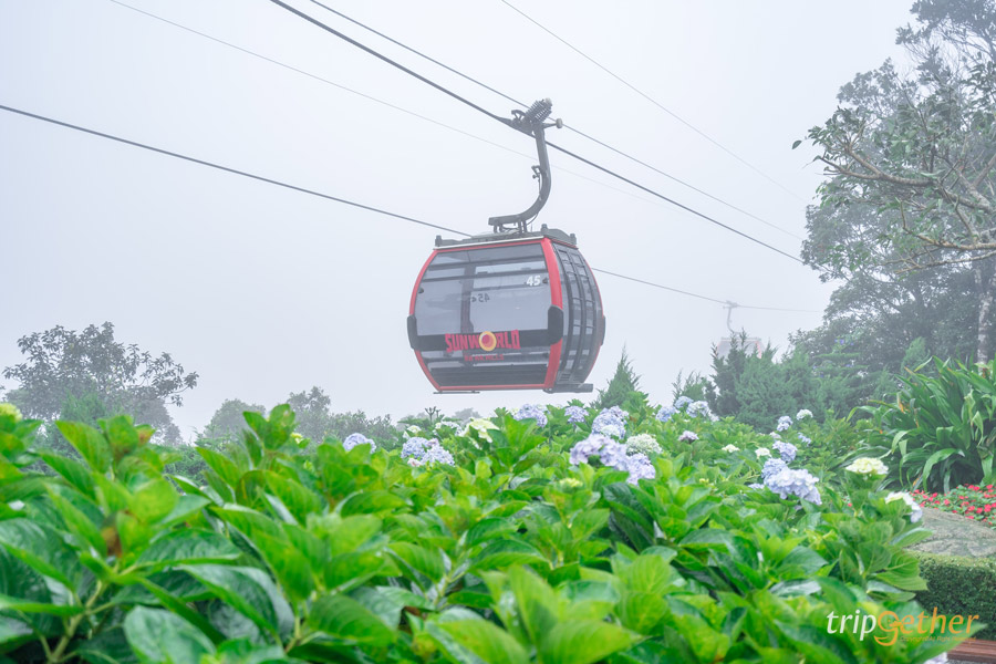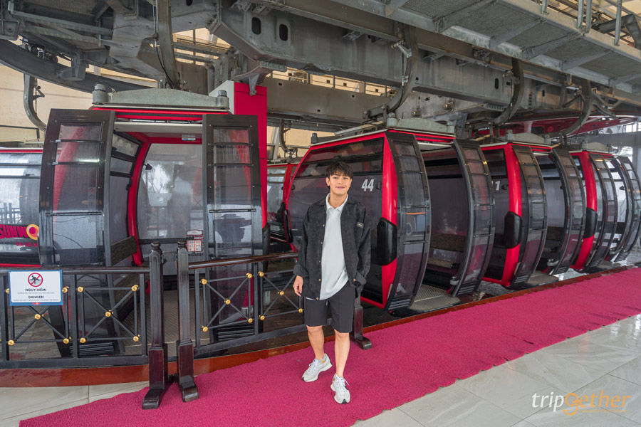 หลังจากซื้อตั๋วและเช็คอินแล้ว ก็จะมีพนักงานนำทางเราไปยังจุดขึ้นกระเช้าเคเบิ้ลไฟฟ้า เพื่อนั่งขึ้นไปยังหมู่บ้านฝรั่งเศสที่อยู่บนยอดเขา