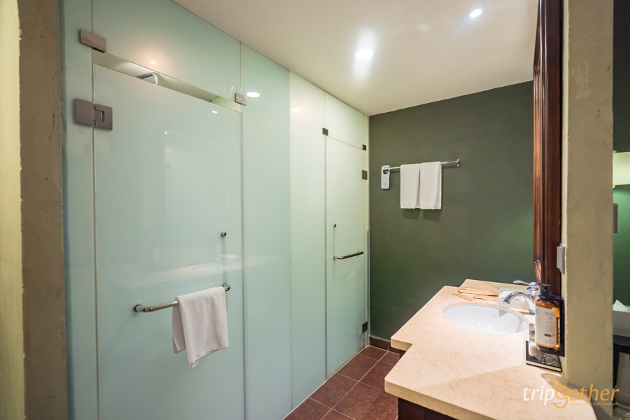 ห้องน้ำได้แยกโซนห้องอาบน้ำและห้องสำหรับเข้าห้องน้ำให้ พร้อมกับอ่างล้างหน้าขนาดใหญ่ พร้อมกระจก และอุปกรณ์อาบน้ำที่ครบครัน