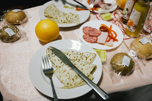 Breakfast จะเสริฟที่ห้อง ตอน 7:00 ค่ะ จากรูป เราเลือก set ЗАВТРАК-БЛИНЫ/МЯСН (Breakfast Pancake / Meat – SNACK MEAT WITH VEGETABLES, pancakes with cheese and ham, croissants) google translate มา