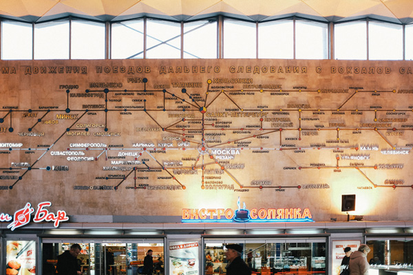 จาก Moscow ไป SPB นั้น รถไฟจะออกจากสถานี Leningradsky railway station (Ленинградский вокзал) และสถานีปลายทางคือ Moskovsky railway station (Санкт-Петербург-Главный) เราสามารถเดินทางไป Leningradsky railway station ได้โดยขึ้น metro ไปลงที่ Komsomolskaya Station (Комсомо́льская)