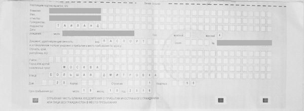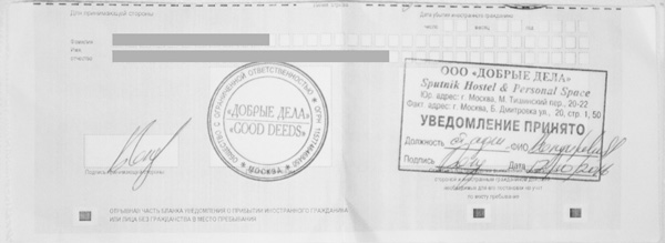 ตอนที่หาข้อมูลก่อนจะไป เรื่อง Visa Registration เนี่ยเป็นเรื่องที่งงที่สุด อ่านหลายๆที่ ก็เริ่มงงหนักไปอีก ไม่แน่ใจว่าถ้าอยู่ Moscow 4 วัน SPB 5 วัน อย่างงี้ต้องทำแค่เมืองเดียว หรือ 2 เมือง หรือไม่ต้องทำเลย พอเข้าไปใน web ที่พัก เห็นเค้ามีให้ทำ Visa Support ก็เข้าใจว่ามันคือ Visa Registration รีบจิ้มเลยจ้าาา กรอกข้อมูล บัตรเครดิตตัดเงินเสร็จสรรพ พอมาอ่านเมลล์ที่เค้าส่งมาให้ อ่าวเฮ้ยยย นี่มันเป็น Visa Invitation นี่น่า (เสียงอะตอม) ที่เอาไว้ยื่นตอนขอ visa หนิ แต่…ไทยไม่ต้องใช้ visa… ฉันทำอะไรลงไป เสียค่าโง่ไป 1,500 RUB สบายใจ จากปสก.ที่ไปมา ตอนที่เราไปถึง hostel ทาง host เค้าจะขอ passport และ immigration card ของเราไป copy ไว้ค่ะ แล้ววันถัดมา เค้าก็จะเอาใบ Visa Registration มาให้เรา ทาง hostel เค้าจะทำเรื่องให้เอง ค่าธรรมเนียมแล้วแต่ hostel นะคะ บางที่ก็ฟรี บางที่ก็เสียตังค่ะ อย่างที่ Sputnik ฟรี แต่ที่ Simple Hostel, SPB เสียตังประมาณ 500 RUB ค่ะ หน้าตาประมาณนี้ค่ะ อันนี้ก็เก็บดีๆ นะคะ อย่าทำหาย