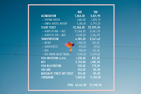 เรื่องราวก็ผ่านมาถึงตอนจองตั๋ว ไม่รู้อะไรเข้าสิง อยู่ดีๆ ก็มีตั๋วไม่รู้ตัว รู้ตัวอีกทีตอนบัตรเครดิตตัดเงิน ตั๋วที่จองนี่ก็ไม่ได้ถูกหรือเป็นราคาโปรโมชั่นนะ ตอนจองผีผลัก ทริปนี้เดินทางด้วยสายการบิน Aeroflot ทั้งไป-กลับ และ domestic ค่ะ โดยเริ่มทริปที่ Moscow บินตรง 10 ชม. Bangkok – Moscow ราคาตอนจอง ประมาณ 20k แต่ถ้าคนที่ทำบุญมาดี อาจจะได้ราคาโปร 18k ก็ส่องกันดีๆ นะคะ ใจต้องแข็ง ใจไม่แข็งก็ต้องใช้เงินแก้ปัญหา คนที่แพ้ก็ต้องดูแลตัวเอง ตอนหาตั๋วก็จะมีอีกเจ้านึงที่น่าสนใจ คือ S7 แต่ S7 จะบิน via Irkutsk, Russia เหมือนจะถูกกว่า Aeroflot แต่ตอนนั้นผีให้เลือก Aeroflot