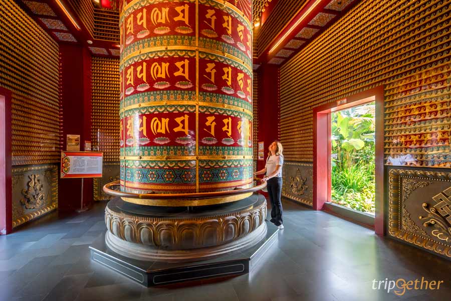 หลังจากไหว้ขอพรเสร็จแล้วก็อย่าลืมขึ้นมาที่ ชั้นดาดฟ้า เพื่อมาหมุน กงล้ออธิษฐาน หรือระฆังใบใหญ่ที่นำมาจากทิเบต มีลายฉลุเป็นบทสวดมนต์โดยรอบ วิธีหมุนก็คือให้หมนุเดินรอบระฆัง 3 รอบ พร้อมขอพรไปด้วยเชื่อกันว่าจะทำให้พรสำเร็จสมปรารถนา