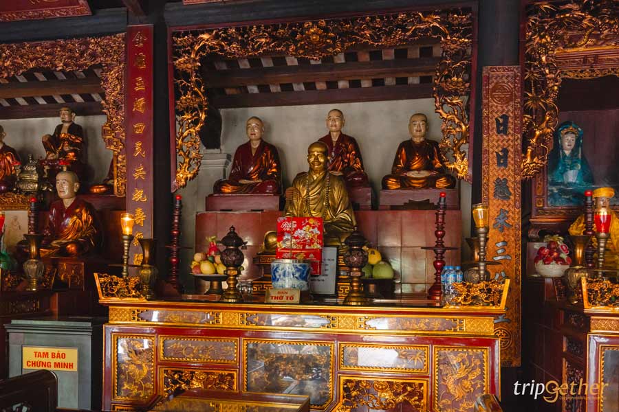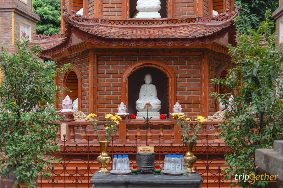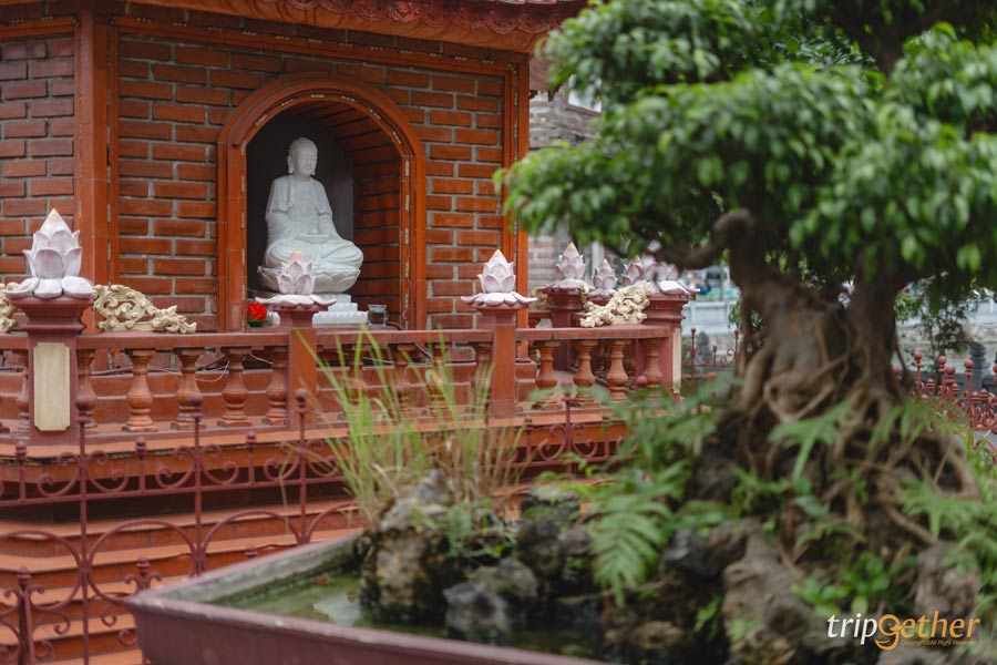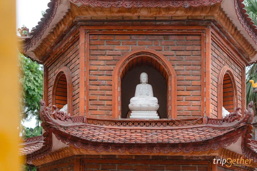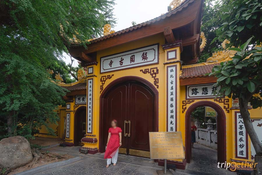 มาถึงหน้าประตูวัด พบกับประตูวัดโบราณ 3 ช่อง ตามความเชื่อของชาวเวียดนาม ประตูกลางปิดไว้เชื่อว่าจะช่วยป้องกันสิ่งไม่ดีเข้ามา พอเราเดินผ่านประตูเข้ามาแล้ว จะพบกับรั้วสีทองทอดยาว และเราจะพบกับไฮไลท์ของวัดนี้ คือ เจดีย์เฉินก๊วก เจดีย์หกเหลี่ยมทำจากอิฐสีแดง 11 ชั้น สูง 15 เมตร