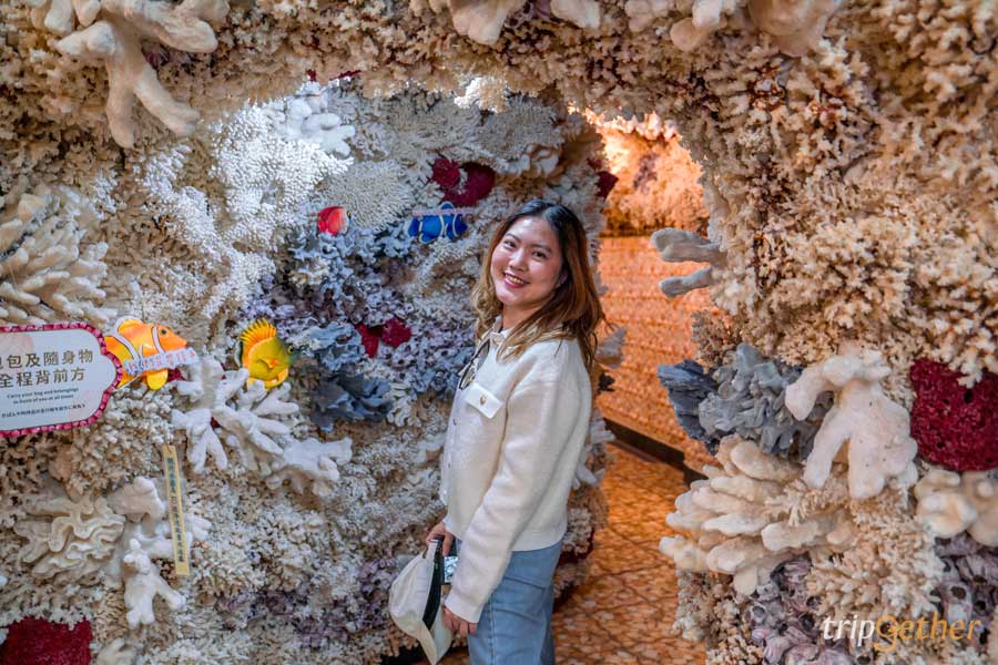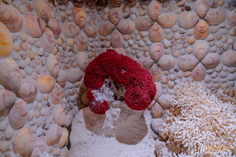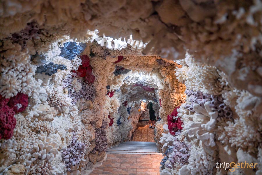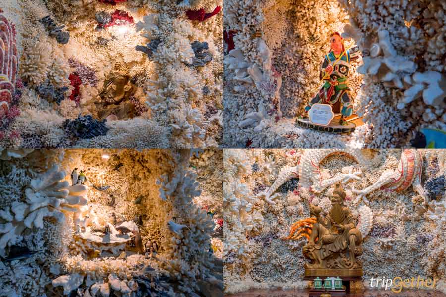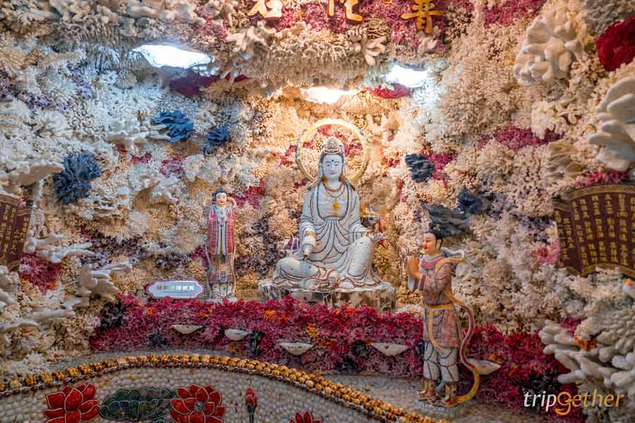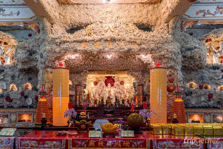 ภายในวัดจะมีอุโมงเล็กๆ ให้ฟีลเหมือนอยู่ใต้ทะเล ซึ่งเราต้องมุดลอดเข้าไปสักกการะองค์เทพเจ้ามากมายที่อยู่ข้างในนั้น โดยประดิษฐานท่ามกลางประติมากรรมเปลือกหอยที่สวยงามโดดเด่นสะดุดตามาก
