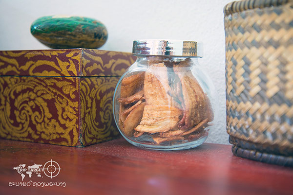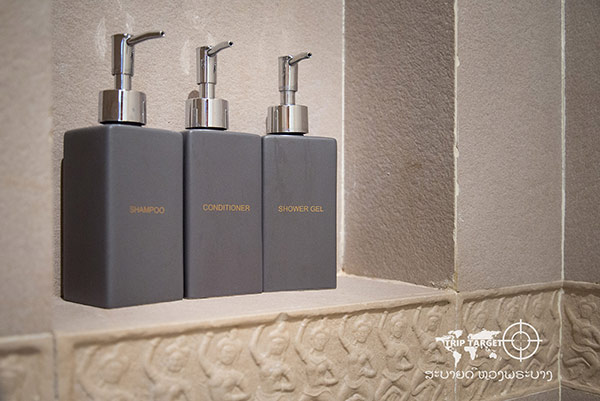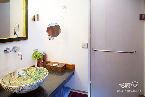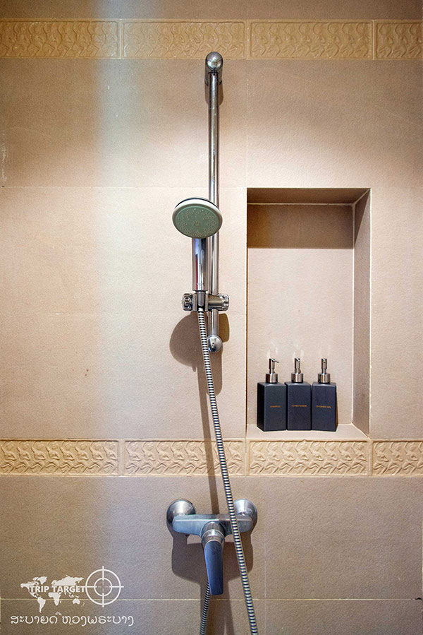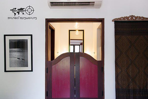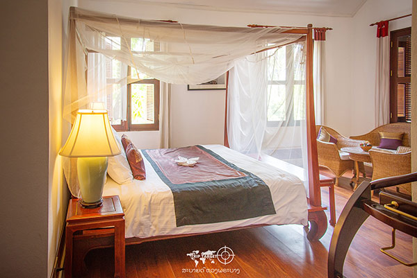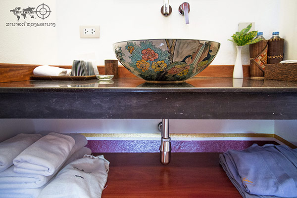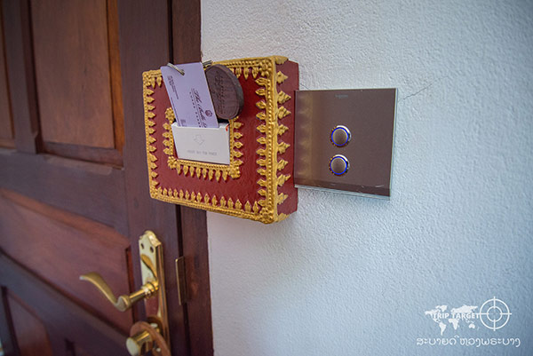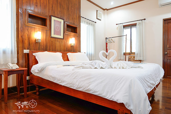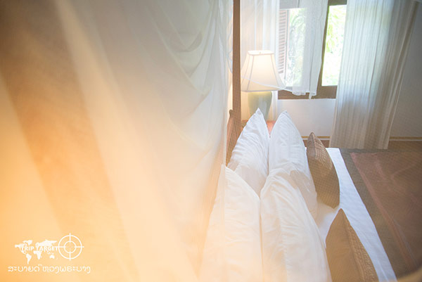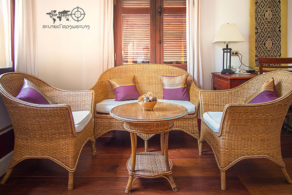 ห้องพักที่จองเป็นแบบ Terrace Room ไม่ใหญ่ไม่เล็ก แต่ตกแต่งแสดงถึงศิลปะวัฒนธรรมลาวได้สวยงามทีเดียว ภายในห้องยังแฝงความน่ารักด้วยตระกร้าผลไม้และกล้วยฉาบ ที่ให้แขกรับประทาน พร้อมมินิบาร์ที่ให้บริการฟรีทั้งน้ำเปล่าและน้ำอัดลม