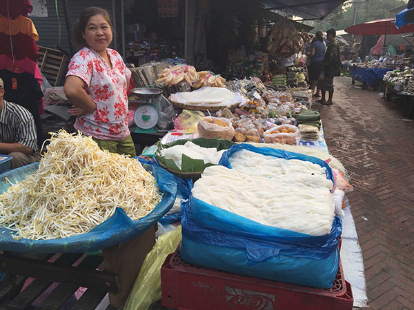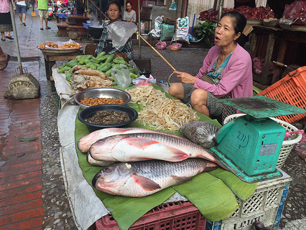 จิบกาแฟเสร็จก็แวะไปที่ตลาดเช้า ซึ่งอยู่ไม่ไกลกัน เป็นซอยเล็กๆ ถ้าปั่นจักรยานไปจอดเค้าจะเก็บค่าที่จอด น่าจะคนละสิบบาทมั้ง ตลาดก็คล้ายตลาดสดบ้านเรา แต่ของวางแบกะดินซะเยอะ  คนที่เดินจับจ่ายซื้อของส่วนมากก็เป็นคนท้องถิ่นมากกว่า