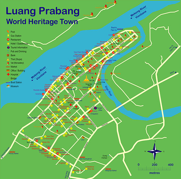 บอกเล่าสภาพภูมิประเทศของเมืองหลวงพระบางกันก่อน หลวงพระบางเป็นเมืองเอกของแขวงหลวงพระบาง อดีตเคยเป็นราชธานีสมัยอาณาจักรล้านช้าง ตัวเมืองจะแบ่งเป็นเขตตัวเมืองชั้นในและตัวเมืองชั้นนอก โอบล้มด้วยแม่น้ำ 2 สายสำคัญของ สปป.ลาว คือแม่น้ำโขงกับแม่น้ำคาน สถานที่เที่ยวหลักๆจะอยู่ในเขตตัวเมืองชั้นใน เขตตัวเมืองชั้นในหลวงพระบาง