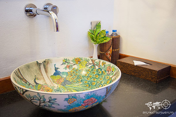 เปิดมาเจออ่างล้างหน้าเป็นกระเบื้องเคลือบลายสวยงาม ด้านล่างมีผ้าขนหนูและเสื้อคลุมเตรียมไว้ให้เสร็จสรรพ