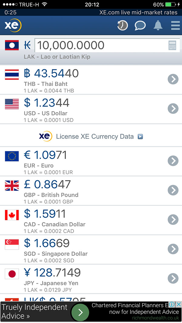 ส่วนการแลกเงินเที่ยวหลวงพระบาง ผมใช้วิธีแลกแบงค์ยี่สิบไป2พัน แบงค์ร้อยอีก 2พัน แล้วไปแลกเงินกีบที่สนามบินหลวงพระบางส่วนหนึ่ง ใช้ไม่พอค่อยไปแลกเพิ่มในตัวเมือง(มีจุดแลกหลายจุดแถวถนนคนเดิน) ภายในเมืองนอกจากเงินกีบก็ใช้เงินบาทได้ แต่แนะนำว่าใช้เงินกีบเป็นหลัก ไม่พอค่อยให้เค้าคิดราคาเงินบาท ถ้าใครมีสมาร์ทโฟน แนะนำใช้แอพ Currency Exchange (มีหลายแอพ ผมใช้แอพ XE ) เพื่อคำนวนเวลาเค้าคิดเงินกีบแปลงเป็นบาท บางร้านจะโก่งเพิ่มพอสมควร แต่ถ้าร้านอาหารหรือร้านกาแฟดีๆส่วนใหญ่จะราคาตรงกัน หน้าตาแอพ XE Currency Exchange ค่าเงินกีบในภาพ คือค่าเงิน ณ วันที่ 17-06-59  หนึ่งหมื่นกีบ = 43 บาท