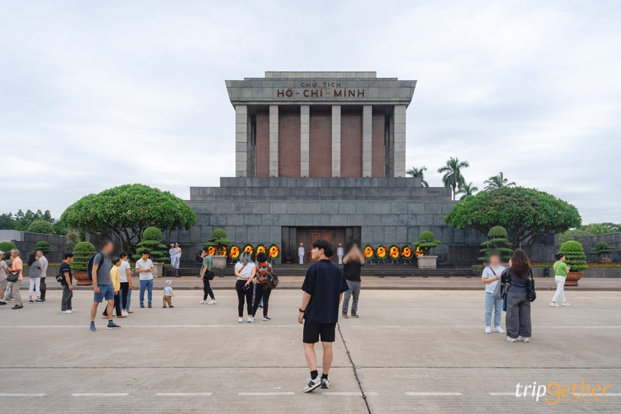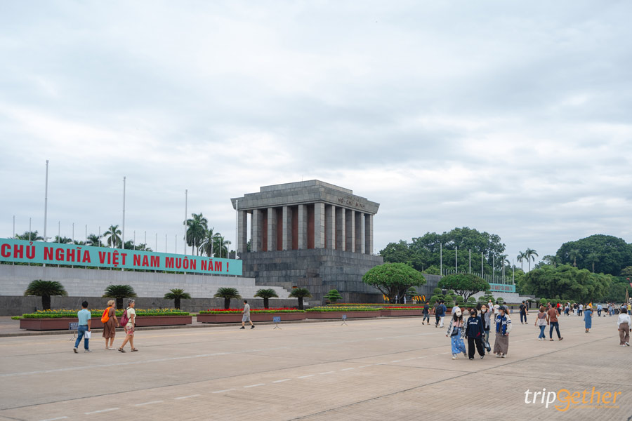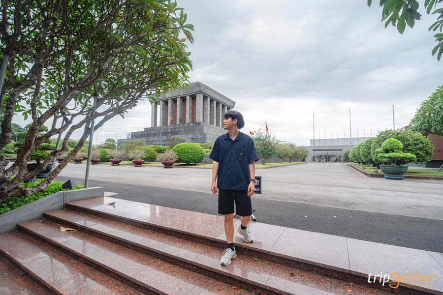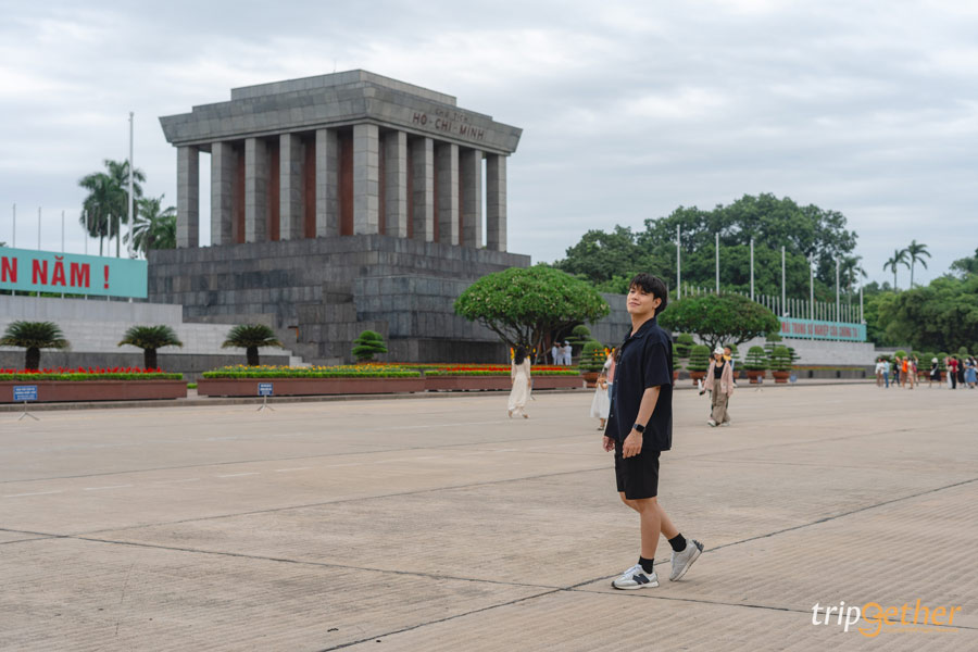 เราเดินจาก จัตุรัสบาดิ่ญ มายังสุสานโฮจิมินห์เพียง 500 เมตร เพื่อเข้ามาเคารพประธานาธิบดีคนแรกของเวียดนาม เพราะภายในเป็นที่เก็บรักษาร่างของโฮจิมินห์ โดยมีทหารแต่งเครื่องแบบเกียรติยศ ยืนประจำการอยู่ทั่วทั้งอาคาร เรานำรูปเพียงด้านหน้าของสุสานมาฝาก เพราะด้านในไม่อนุญาตให้บันทึกภาพ หรือนำอุปกรณ์สื่อสารเข้าไป และแต่งกายสุภาพ สวมกางเกงขายาว และไม่สวมสิ่งใดไว้บนศีรษะของเรา และที่นี่ได้ชื่อว่าเป็นอนุสรณ์สถานที่ใหญ่ที่สุดในฮานอย
