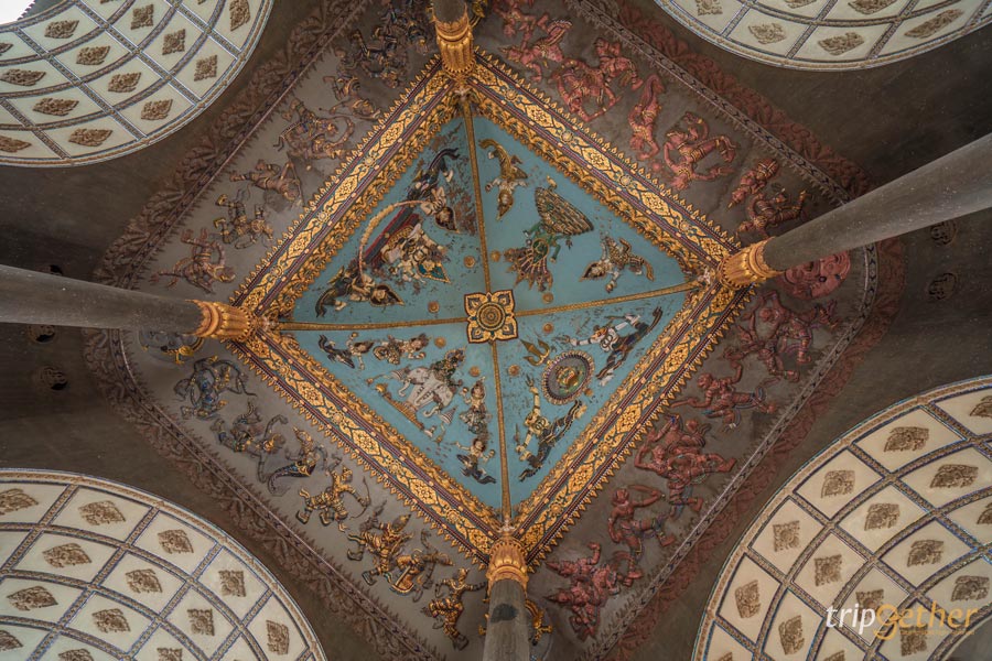 ด้านในซุ้มบริเวณเพดาน ได้มีลวดลายเกี่ยวกับเรื่องราวความเชื่อตามพุทธศาสนาและตัวละครในเรื่องรามเกียรติ์ให้ได้ชมความสวยงามกันอีกด้วย และในส่วนเพดานโค้งที่ซุ้มประตูทั้ง 4 ทิศ ยังมีตารางพร้อมกับประติมากรรมลายเทพพนมและลายประจำยามสุดวิจิตรประดับอยู่