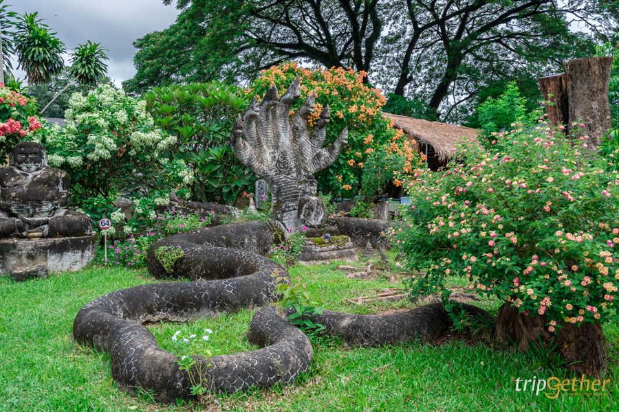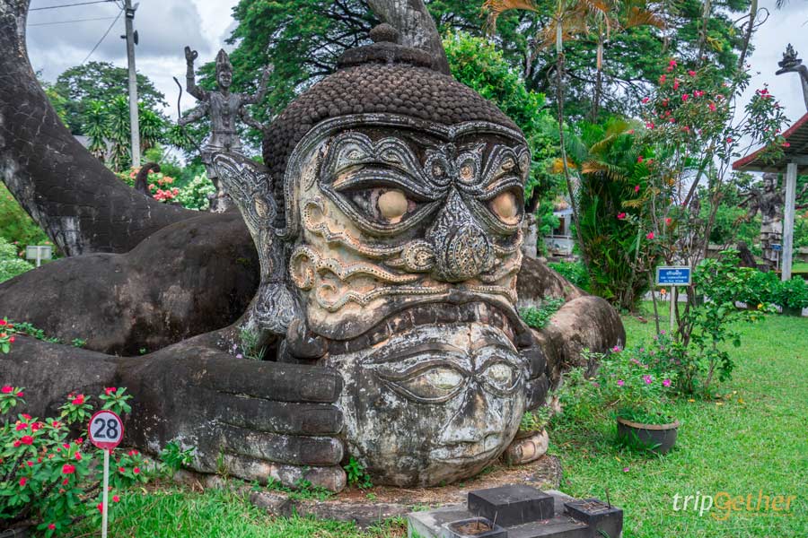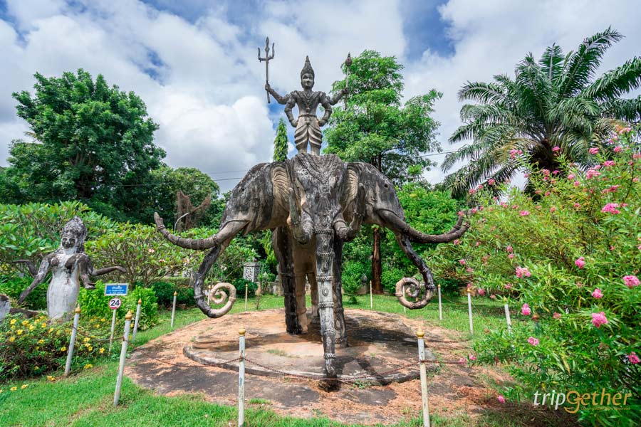ภายในอุทยานเต็มไปด้วยรูปปั้นต่างๆ ทั้ง พระพุทธรูป รูปปั้นของเทพเจ้าฮินดู เช่น พระวิษณุ พระศิวะ และรูปปั้นอื่นๆ ตัวละครของความเชื่อทางพุทธศาสนาอีกหลายแบบ รวมแล้วกว่า 200 องค์ ที่โดดเด่นคือ พระอินทร์ทรงช้างเอราวัณ ซึ่งพระอินทร์คือราชาแห่งเทพเจ้าของศาสนาฮินดู