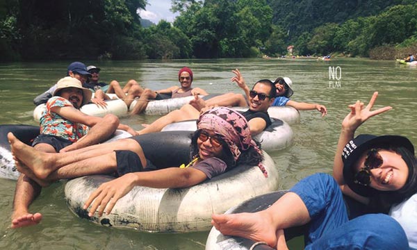 คนอื่นลอยยังไงไม่เราไม่รู้แต่เราลอยเปนทีมผูกห่วงยางของทุกคนเข้าด้วยกัน ลอยกันเป็นแพ ลอยไปกินเบียร์ลาวไป กับมุกของพี่ใจคนพายเรือนำ ตลอดทาง 1 ขั่วโมงครึ่งของการ tubing จึงผ่านไปอย่างรวดเร็ว.. (tubing ครั้งนี้ใช้เวลาน้อยเพราะเป็นช่วงหน้าฝนน้ำเยอะและค่อนข้างแรง)