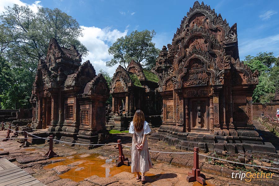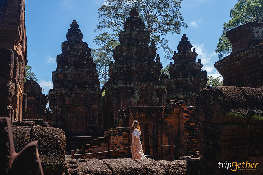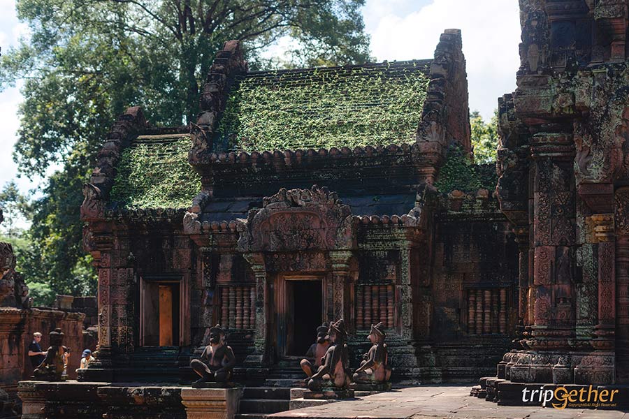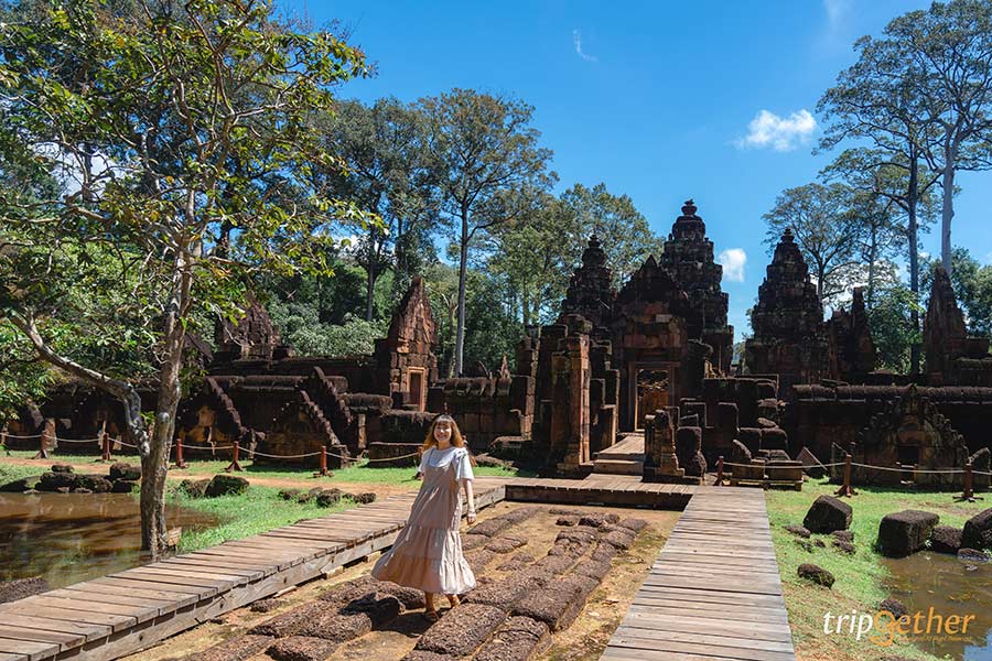 ปราสาทบันทายศรี ถูกสร้างด้วยหินทรายสีชมพู ทำให้มีความสวยงามไม่เหมือนกับปราสาทอื่น อีกทั้งยังเป็นปราสาทที่มีความสมบูรณ์ที่สุด ที่นี่จะเด่นในเรื่องของงานแกะสลักนูนสูง จะเป็นได้ว่าทุกหน้าบันและทับหลังมีภาพแกะสลักที่สวยงาม ประณีต และภาพเหล่านี้มีเรื่องราวมากมาย ไม่ว่าจะเป็นวิถีชีวิต วัฒนธรรม ตำนานวรรณคดี การบูชาเทพเจ้า ถึงแม้จะเป็นปราสาทเล็กๆ แต่ถ้าใครชอบศิลปะที่วิจิตรงดงาม บอกเลยเป็นที่เที่ยวเสียมราฐที่ห้ามพลาด