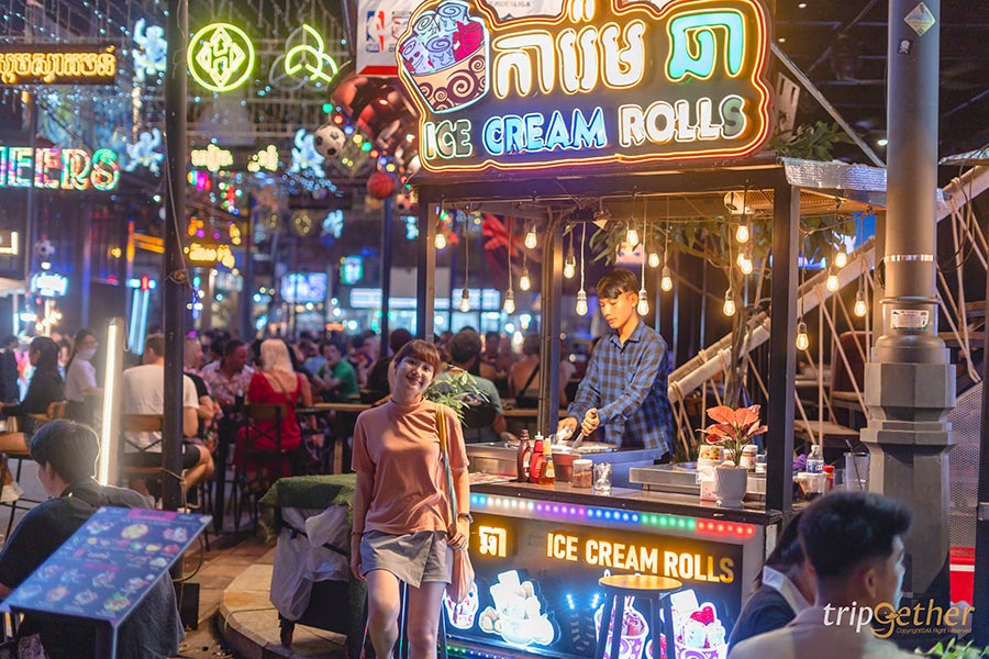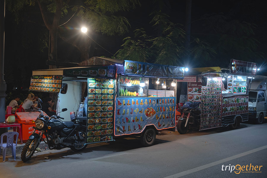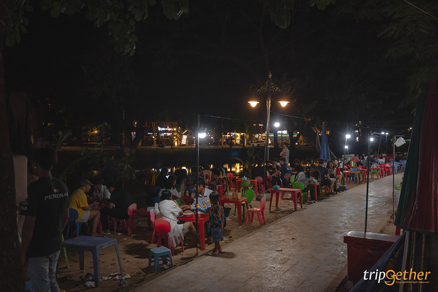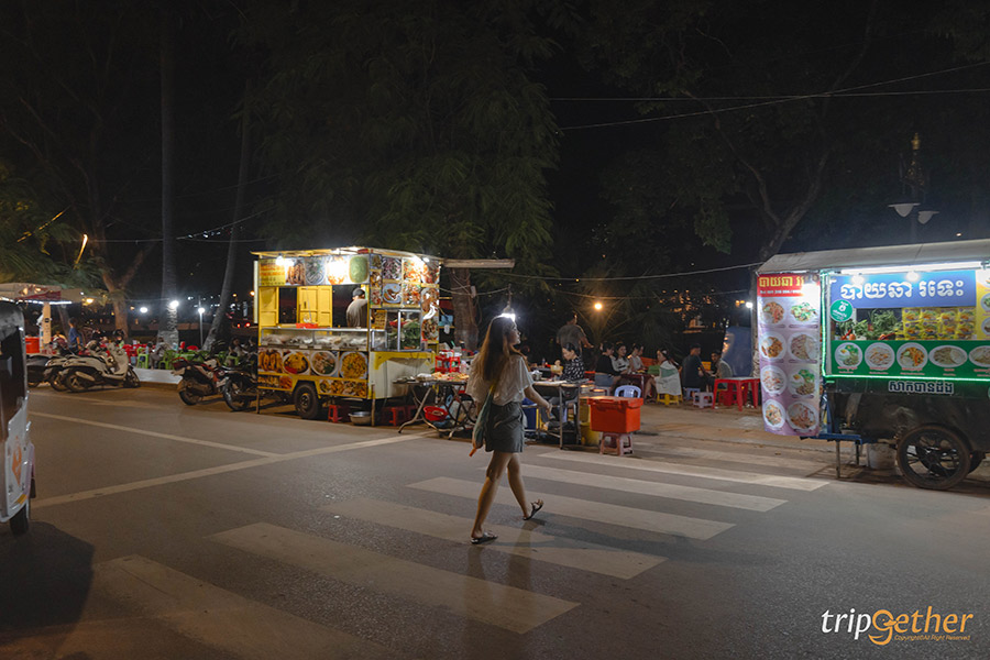 หลังจากเดินซื้อของที่ตลาด Old Market เรียบร้อยก็สามารถแวะมาหาของกินกันต่อที่ Street Food อยู่ติดริมแม่น้ำเสียมราฐ เป็นร้านรถเข็นเล็กๆ จำนวนมากกว่า 20 ร้าน เริ่มตั้งขายตั้งแต่ช่วงเย็นเป็นต้นไป อาหารมีหลายอย่าง ทั้งซีฟู้ด ปิ้งย่าง อาหารตามสั่ง หรือจะเป็นของหวานและเครื่องดื่มก็มีเช่นกัน อาหารส่วนใหญ่ของกัมพูชาจะไม่ต่างจากอาหารไทย หน้าตาและรสชาติคล้ายๆ กัน ราคาเริ่มต้นอยู่ 1.5 ดอลลาร์ และพอเราสั่งอาหารเรียบร้อยก็จะมานั่งกินที่ริมน้ำ เป็นโต๊ะเก้าอี้เล็กๆ บรรยากาศชิลล์ๆ มีทั้งคนกัมพูชาและนักท่องเที่ยวเพียบ ถือว่าเป็นอีกที่เที่ยวเสียมราฐที่แนะนำเลย
