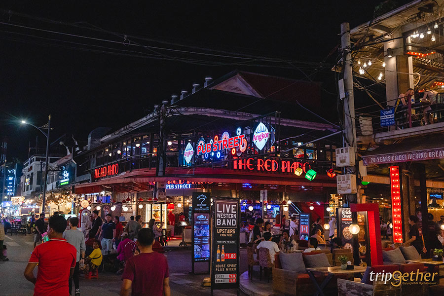 เปลี่ยนบรรยากาศความเป็นเมืองเก่า มาเปิดโลกแสงสีกันที่ Pub Street แหล่งบันเทิงยามค่ำคื่นที่เต็มไปด้วยนักท่องเที่ยวต่างชาติ ฟีลคล้านๆ กับถนนข้าวสารที่เป็นถนนสั้นๆ สองข้างทางมีทั้งร้านนั้งชิลล์ ผับ ร้านอาหาร บรรยากาศจะยิ่งครึกครื้นในช่วงกลางคืน ทุกร้านเปิดแสงสีและเสียงเพลงแบบจัดเต็ม เอาใจคนชอบเที่ยวให้ได้สนุกตลอดทั้งคืน หรือใครอยากไปหาของกินอร่อยๆ ก็ได้ มีร้านอาหารเยอะ หลายแนว ไม่ว่าจะเป็นอาหารกัมพูชา อาหารอิตาเลี่ยน หรือจะเป็นแนวสตรีทฟู้ดก็มี