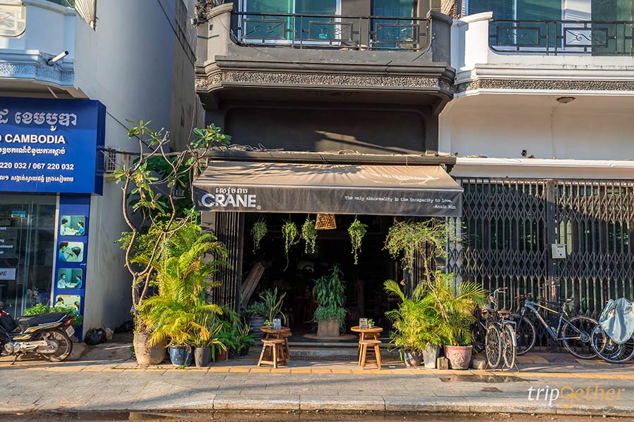 CRANE คาเฟ่เสียมราฐตึกแถวเล็กๆ ที่เดินผ่านแล้วต้องหันกลับไปมอง การตกแต่งร้านไปในทางเดียวกับด้วยเฟอร์นิเจอร์ไม้และของตกแต่งแนววินเทจ รวมถึงมีสีเขียวจากไม้ประดับต่างๆ ทำให้บรรยากาศโดยรวมอบอุ่นและย้อนวันวาน เมนูในร้านส่วนใหญ่เป็นอาหารคาว ทั้งเมนูอาหารพื้นเมืองและนานาชาติ ใครกินอาหารมังสวิรัติก็มีเสิร์ฟ นอกจากนี้ก็ยังมีเครื่องดื่มและเบเกอรี่ด้วย