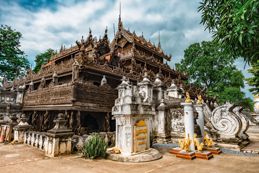 อารามปราสาททอง อารามแห่งนี้เป็นส่วนหนึ่งของพระราชวังที่หลงเหลือจากช่วงสงครามโลกครั้งที่ 2 อารามสร้างจากไม้สักแกะสลัก เคยเป็นตำหนักเก่าของ พระเจ้ามินดง หลังจากพระองค์สิ้นพระชนน์จึงได้รื้อถอนและนำมาถวายวัด ภายในเต็มไปด้วยภาพแกะสลักที่ประณีตอ่อนช้อย ภายในยังมีพระพุทธรูปให้สักการะบูชาเพื่อความเป็นสิริมงคลอีกด้วย เรียกได้ว่ามาที่นี่ได้ทั้งไหว้พระขอพรและชมสถาปัตยกรรมที่วิจิตรงดงามแบบศิลปะมัณฑะเลย์