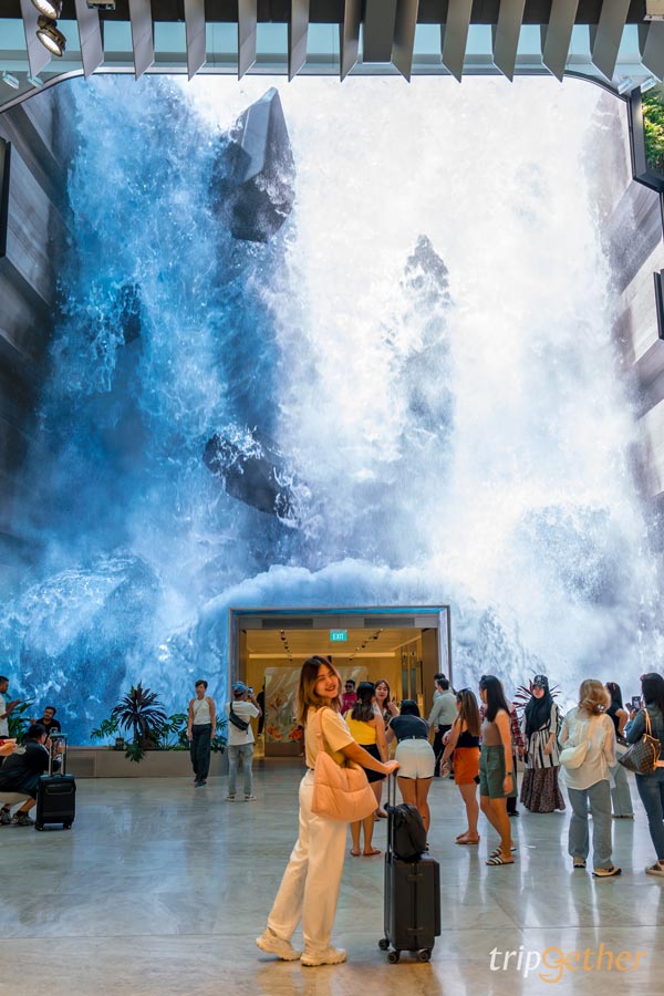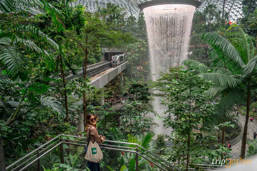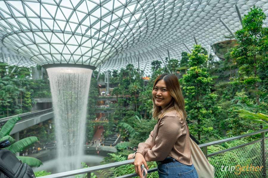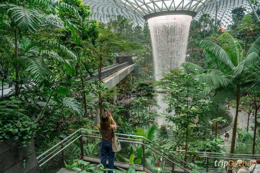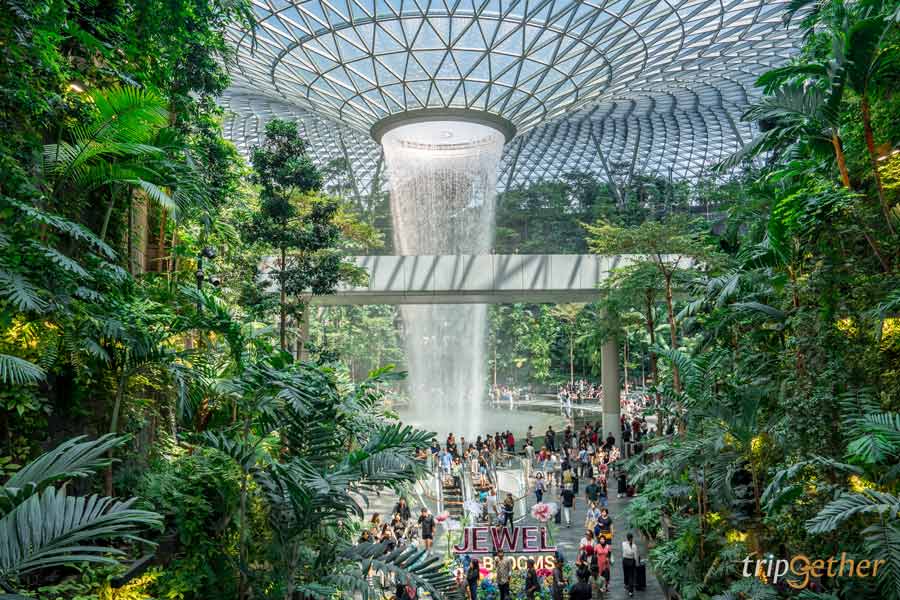 พามาที่ Termanal 1 กับจุดเช็คอินแรกของ Changi Airport สิงคโปร์นั่นก็คือ Jawel Changi Airport ห้างสรรพสินค้าสุดปัง! ที่ทำให้การรอเครื่องบินที่สนามบินนั้นมีชีวิตชีวามากขึ้น เพราะนอกจากจะเป็นที่ให้ช้อปปิ้งแล้ว ที่นี่ยังมีกิจกรรมให้ทำฆ่าเวลาเยอะมาก และมี ไฮไลท์คือ The Rain Vortex น้ำตกใหญ่กลางห้างที่ไหลจากเพดานกว่า 40 เมตรลงสู่พื้น ครบคลุมทุกชั้นตั้งแต่ด้านบนสุดจนถึง B2 ของ Jewel Changi ซึ่งแต่ละชั้นก็จะได้ภาพและมุมมองต่างกัน ถือเป็นสุดยอดสถาปัตยกรรมน้ำตกในร่มที่ใหญ่ที่สุดในโลก!