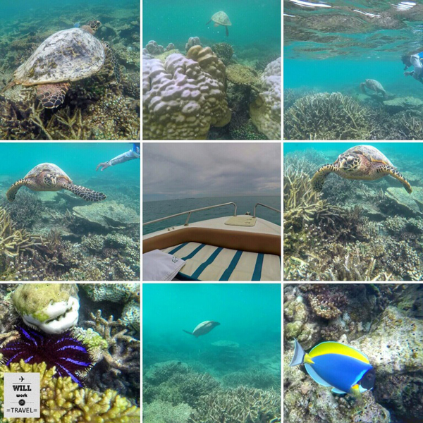 ตื่นสายมาก…อีกตามเคย! กินข้าวเช้าแล้วเราก็เข้าไปนอน….ไม่ใช่! วันนี้จองทริปไป snorkeling ค่ะ ราคาคนละ 25USD + ค่าอุปกรณ์ 5USD ++ ทริปนี่จองล่วงหน้าได้ 1 วันค่ะเลือกเวลาได้ใช้เวลา trip ประมาณ 2 ชั่วโมง เลยเลือกไปบ่ายคล้อยๆหน่อยแดดจะได้ไม่ร้อน วันนี้ครึ้มนิดๆค่ะ แต่ฝนก็ไม่ยักจะตก รูปเลยดูมืดนิดนึงเนอะ นัดไว้ 2โมงปุ๊บเราก็นั่งสปีดโบ๊ท (ส่วนตัวด้วยนะคุณ) – ออกห่างจากเกาะประมาณ 10 นาทีเราก็มาถึงจุด Turtles Point ระดับความลึกกะด้วยสายตาไล่ยาวไปตั้งแต่ 3-5 เมตร .. เป็นช่วงเวลา กว่า 2 ชั่วโมงที่แทบไม่เงยหน้าขึ้นมาจากน้ำเลย!!! ตื่นเต้นตลอดเวลา เพราะเดี๋ยวลีดก็ชี้ตรงนั้น เดี๋ยวก็ชี้ตรงนี้ นั่นเต่า นี่หอย นั่นเต่าอีกแล้ว สนุกมาก!! (เป็นคนดำ Scuba ค่ะ ยอมรับเลยว่า ปะการัง ปลา เต่า สมบูรณ์จริงๆ แต่ก็เสียใจและเสียดาย บางส่วนของปะการังกำลังฟอกขาว บางส่วนก็หักพังไปมาก…) ขึ้นจากน้ำได้ปีนขึ้นเรือนี่แข้งขาอ่อนเลยค่ะ ตีฟินสปรินท์ตามเต่า สนุกมากๆ