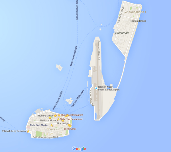 – เกาะบนเรียก Hulhumale (มีถนนเชื่อมต่อจากเกาะสนามบิน)