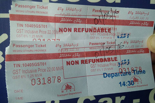 ซื้อตั๋วมาก่อนเลย ราคา 22 รูฟีย่า (1.5 USD) เรือออก 14.30 ค่ะ มีเวลา Boarding Time ด้วยนะคะ 14.15 – เรือที่นี่ตรงเวลามากค่ะ เพราะฉะนั้นใครจะมาลงเรือกะเวลาดีๆนะคะ ตกเรือแล้วมันเจ็บใจค่ะ เพราะว่ามีแค่วันละเที่ยวเดียวเท่านั้น (วิ่งทุกวัน ยกเว้นวันศุกร์นะคะ)
