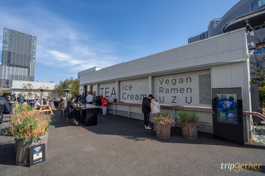 นอกจากนี้ด้านหน้าของอาคารจัดแสดงนิทรรศการ ยังมีร้าน Vegan Ramen UZU ซึ่งเป็นร้านอาหารแนว Vegen ให้ออกมานั่งชิลล์ๆ อีกด้วย เมนูในร้านก็มีทั้งไอศกรีม ชา และราเมง แถมโต๊ะที่อยู่ด้านในร้านและด้านนอกยังเป็นงานศิลปะสุดอาร์ต เพราะจะเป็นโต๊ะกระจกที่สะท้อนภาพท้องฟ้า บอกเลยว่าถ่ายรูปมุมนี้ก็สวยสุดๆ