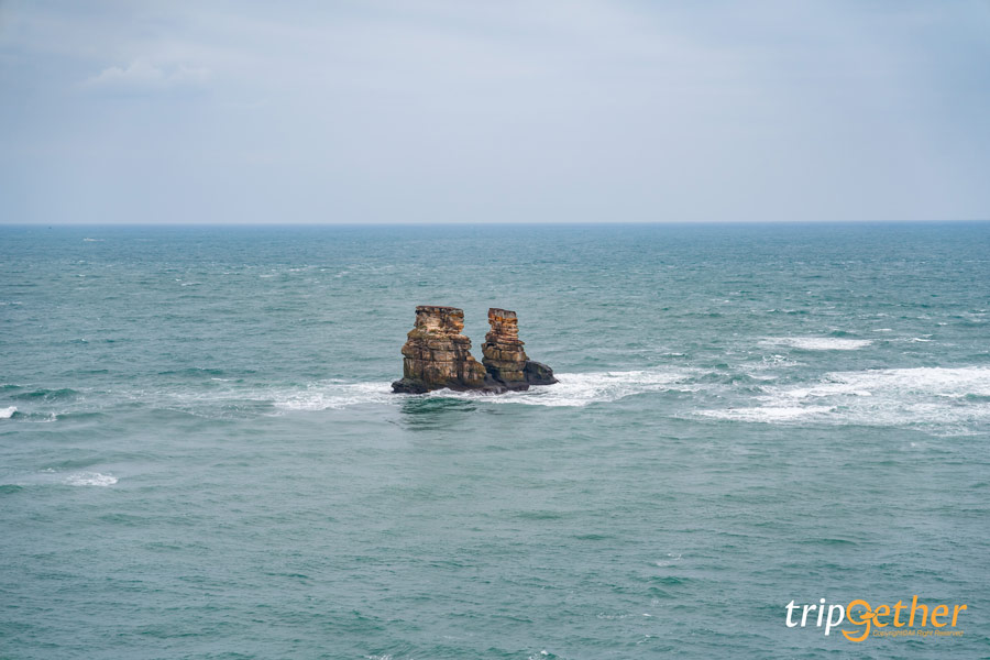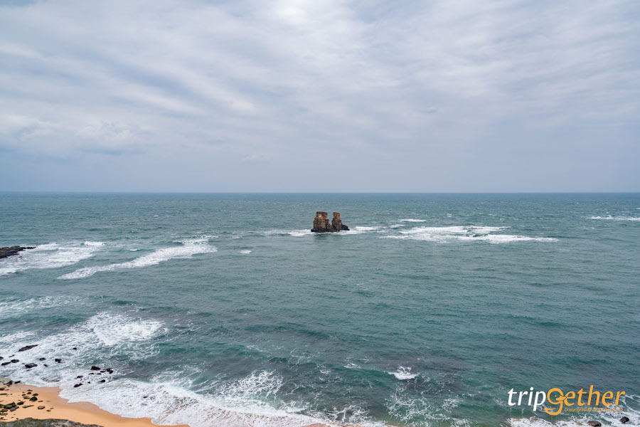และแล้วเราก็เดินมาถึงมาถึงจุดชมวิว ภาพตรงหน้าคือวิวทะเลกว้างสุดลูกหูลูกตาแบบพาโนรามา และยังเห็นเกาะรูปทรงประหลาดซึ่งเป็นไฮไลท์ของที่นี่ เรียกว่า เกาะแฝดเชิงเทียน หรือ เกาะเชิงเทียนคู่ (Twin Candlestick Islets)