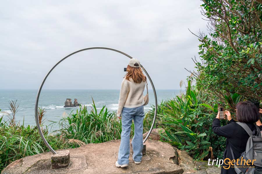 ขอถ่ายเช็คอินเก็บภาพไว้สักหน่อย ไม่ต้องห่วงว่าจะได้มุมถ่ายรูปเกาะเชิงเทียนคู่ไม่สวย เพราะมีจุดถ่ายรูปลักษณะเป็นกรอบวงกลม ตรงกลางมองเห็นเกาะเชิงเทียนคู่ได้ชัดเจน สามารถเดินเข้าไปถ่ายรูปได้เลย